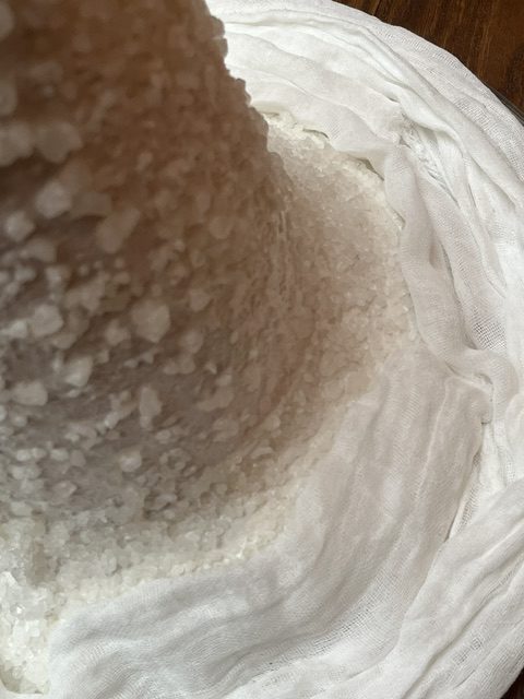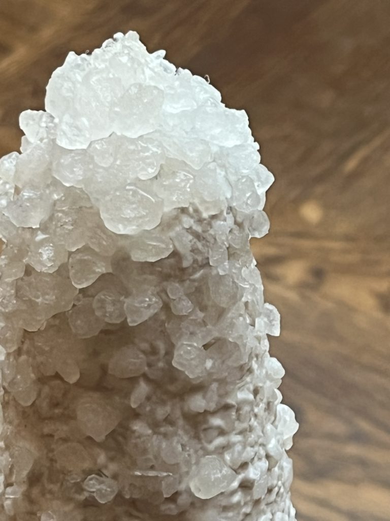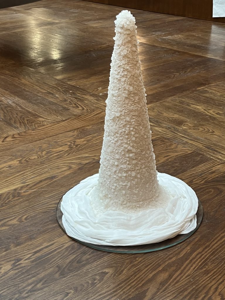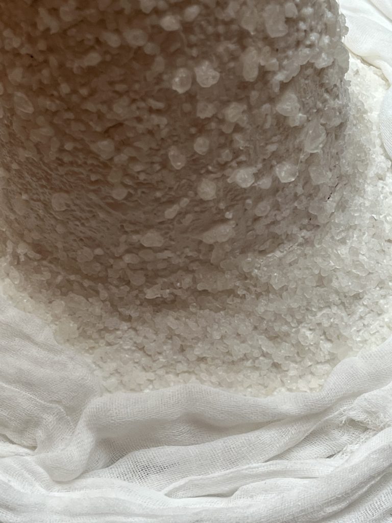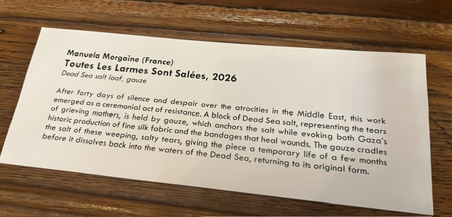 Une installation visuelle et sonore dans une pièce unique pour les ré-unir. Un an plus tard au printemps 2024, devant les massacres continus, m’est venu un diptyque photographique bi faces, Lamentations,représentant des mères endeuillées : israéliennes d’un côté et palestiniennes de l’autre. A côté, ce pain du sel de la mer morte contenant toutes les larmes versées des deux côtés. Le sel est matière vivante. Pour cela il pleure, fond en continu. Cette œuvre a une durée de vie de quelques mois avant de reprendre sa forme première, se résorber en eau de la mer morte.